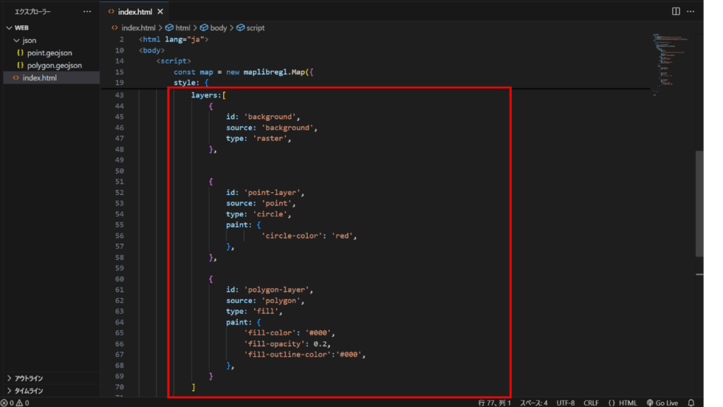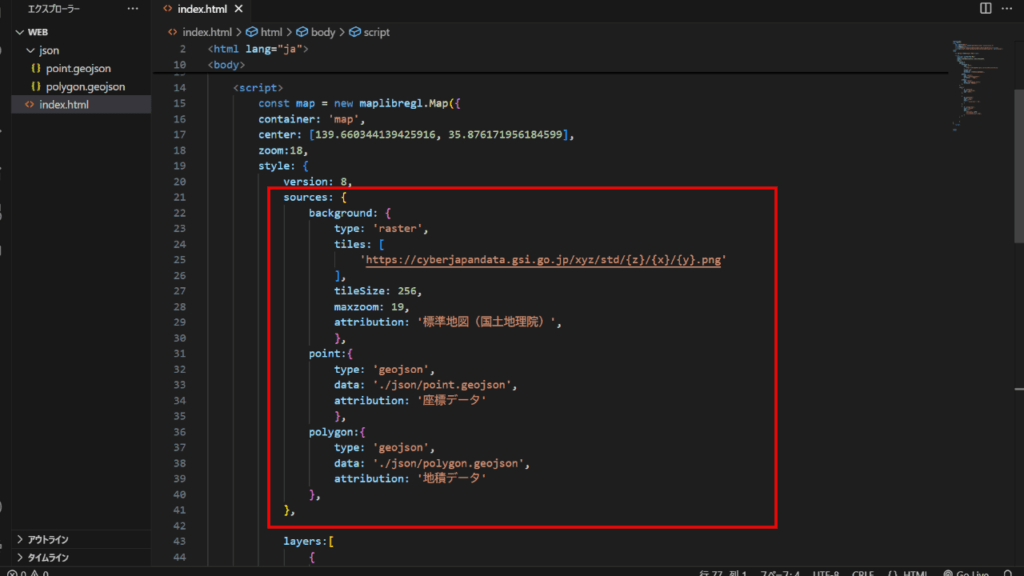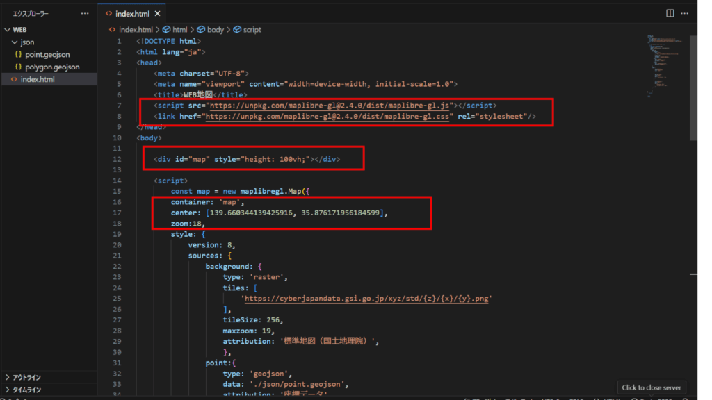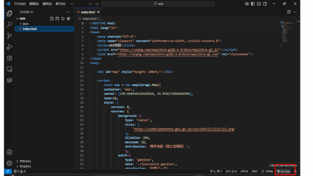 第2回目で作成したGeoJsonファイルを、MapLibre GL JSでWEBブラウザに表示します。