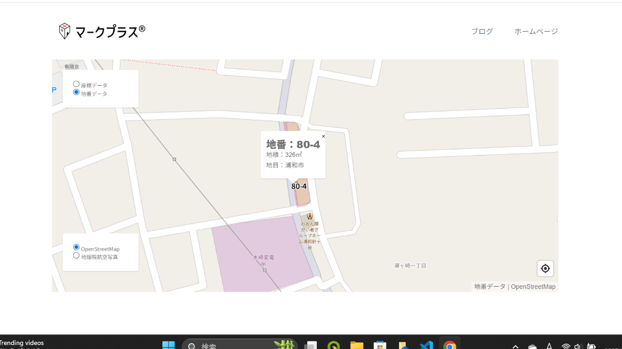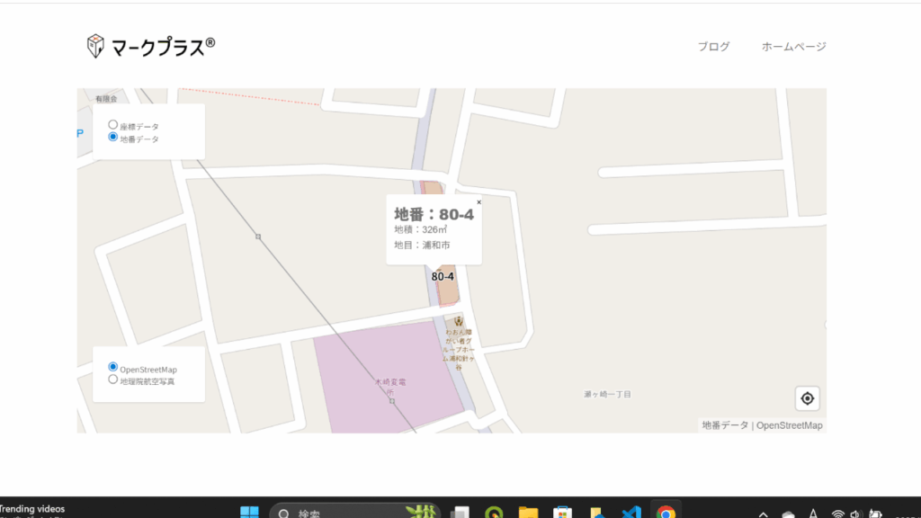 MapLibreで地番データ、境界点データ、国土地理院のタイル地図の重図を作成する。