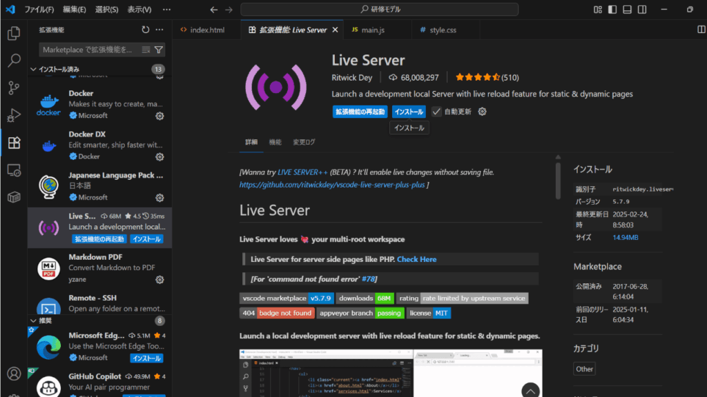 そして、WEBサーバー環境を作ることが出来るVsCodeのプラグインであるLiveserverをVsCodeの拡張機能からインストールします。